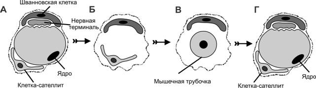 Рис. 7-20. Дегенерация и регенерация мышечного волокна. А — иннервированное мышечное волокно. Б — денервация, повлекшая гибель мышечного волокна; участие макрофагов в фагоцитозе некротизированного материала и активация клеток-сателлитов. В — слияние миобластов с образованием мышечной трубочки; подрастание аксона к месту бывшего нервно-мышечного контакта. Г —дифференцировка зрелого мышечного волокна и формирование нервно-мышечного синапса. [74]