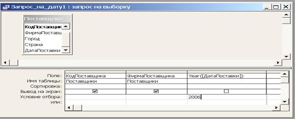 Приклад 1. З таблиці ПОСТАВЩИКИ вибрати записи, де ДатаПоставки – 2006 рік. Вікно конструктора запитів при цьому буде мати вигляд (рис.8.2).