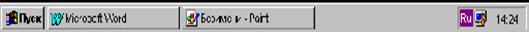 Панель делится на три части. В левой части находится кнопка Пуск, с помощью которой можно получить доступ ко всем ресурсам компьютера. Нажатие кнопки Пуск разворачивает основное меню системы. Правая часть панели используется для системных индикаторов (время, тип клавиатуры – русский или латинский). Центральная часть панели используется для отображения запущенных в работу задач. Если запущена какая-либо программа, то на панели задач появляется кнопка этой задачи. Для перехода из одной задачи в другую достаточно щелкнуть курсором мыши по кнопке.