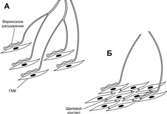 Рис. 7-29. Иннервация гладкомышечной ткани. А. Множественно иннервированная гладкая мышца. Каждая ГМК получает двигательную иннервацию, щелевые контакты между ГМК отсутствуют. Б. Единично иннервированная гладкая мышца. Иннервированы лишь отдельные ГМК. Смежные клетки связаны многочисленными щелевыми контактами, образующими электрические синапсы. [114]