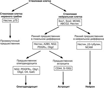 Рис. 8-2. Модель последовательной генерации различных типов клеток в нервной системе.Стволовая нейральная клетка в развивающемся мозге даёт начало клеткам–предшественницам, дифференцировка которых ограничена двумя направлениями — нейрональным и глиальным. Показано прогрессивное ограничение потенций к дифференцировке в различных направлениях. В боксах указаны гены, экспрессируемые на каждой конкретной стадии дифференцировки. [125]