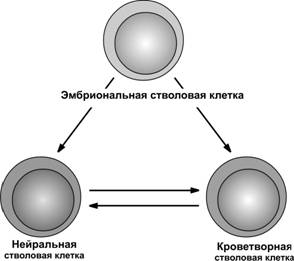 Рис. 8-3. Эмбриональная стволовая клетка даёт начало региональным стволовым клеткам, в данном случае стволовой нейральной и стволовой кроветворной клетке. Показана возможность взаимных переходов этих предшественников, что обозначается термином «трансдифференцировка»: стволовая нейральная клетка может трансдифференцироваться в кроветворном направлении, а стволовая кроветворная клетка способна трансдифференцироваться в нейральном направлении. [143]