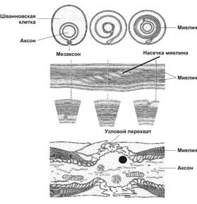 Безмиелиновые нервные волокна состоят из осевых цилиндров, окружённых шванновскими клетками. При погружении осевого цилиндра в шванновскую клетку её клеточная мембрана смыкается и образует мезаксон (рис. 8-17) — сдвоенные мембраны шванновской клетки. Каждая шванновская клетка подобным образом окружает несколько осевых цилиндров.
