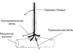 Рис. 8-20. Ветви аксона двигательного нейрона. Коллатерали образуются в области нервной терминали и претерминальной части нервного волокна, но чаще — в узловых перехватах. [17]