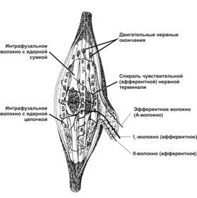 Мышечные веретёна (рис. 8-27) — чувствительные воспринимающие приборы скелетной мышцы. Их количество в различных мышцах значительно варьирует, но они присутствуют практически во всех мышцах, за исключением некоторых глазных. Основные структурные элементы мышечного веретена — интрафузальные мышечные волокна, нервные волокна и капсула. Мышечное веретено содержит от 1 до 10 коротких интрафузальных мышечных волокон. В средней (экваториальной) их части ядра образуют компактное скопление (волокна с ядерной сумкой) или располагаются цепочкой (волокна с ядерной цепочкой). ТерминалиIa-волокон образуют спираль в пределах экваториальной зоны обоих типов интрафузальных мышечных волокон (первичные, или аннулоспиральные окончания). Терминали более тонких II-волокон заканчиваются на интрафузальных волокнах в области, расположенной рядом с экваториальной (вторичные окончания, чаще встречаются в волокнах с ядерной цепочкой). Эфферентные Аg-волокна образуют нервно-мышечные синапсы с интрафузальными волокнами в концевой их части.