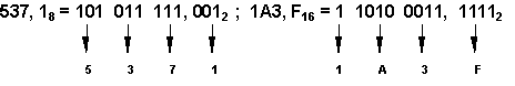 Перевод восьмеричных и шестнадцатеричных чисел в двоичную систему очень прост: достаточно каждую цифру заменить эквивалентной ей двоичной триадой (тройкой цифр) или тетрадой (четверкой цифр).