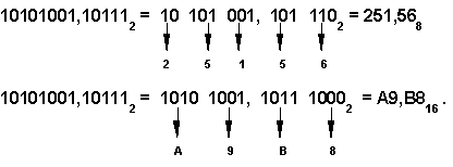 Чтобы перевести число из двоичной системы в восьмеричную или шестнадцатеричную, его нужно разбить влево и вправо от запятой на триады (для восьмеричной) или тетрады (для шестнадцатеричной) и каждую такую группу заменить соответствующей восьмеричной (шестнадцатеричной) цифрой.