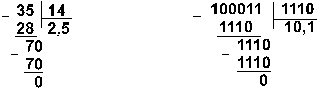 Деление в любой позиционной системе счисления производится по тем же правилам, как и деление углом в десятичной системе. В двоичной системе деление выполняется особенно просто, ведь очередная цифра частного может быть только нулем или единицей.