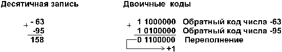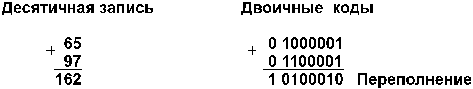 При сложении может возникнуть ситуация, когда старшие разряды результата операции не помещаются в отведенной для него области памяти. Такая ситуация называется переполнением разрядной сетки формата числа. Для обнаружения переполнения и оповещения о возникшей ошибке в компьютере используются специальные средства. Ниже приведены два возможных случая переполнения.