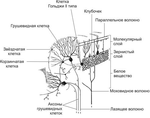 Мозжечок (cerebellum) координирует движения и равновесие, расположен над продолговатым мозгом и мостом и связан со стволом мозга тремя парами ножек, по которым проходят афферентные и эфферентные проводящие пути. В глубине белого вещества мозжечка лежат скопления нейронов — ядра мозжечка. Извилины мозжечка, образующие на разрезе фигуру разветвлённого дерева (arbor vitae), разделены глубокими бороздами. Каждая извилина содержит узкую пластинку белого вещества, полностью покрытую серым веществом (кора мозжечка, рис. 8-37), в котором различают три слоя: наружный — молекулярный, средний — ганглионарный и внутренний — зернистый.