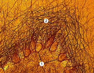 Рис. 8-37А. Кора мозжечка. На препарате видны грушевидные клетки Пуркинье (1), их дендриты образуют густую сеть (2) в молекулярном слое. Импрегнация азотнокислым серебром по Бильшовскому–Гросс.