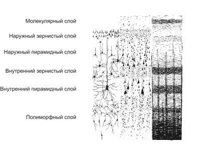 Кора большого мозга (неокортекс) содержит 6 слоёв нервных клеток (рис. 8-39, 8-40).