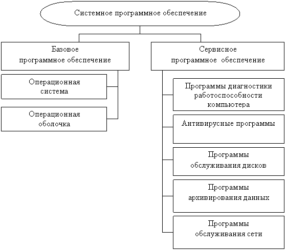 На рис.5.2 представлена структура системного программного обеспечения - базового программного обеспечения, которое, как правило, поставляется вместе с компьютером, и сервисного программного обеспечения, которое может быть приобретено дополнительно.
