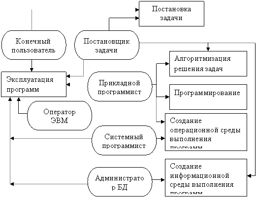 В ряде случаев один специалист совмещает несколько видов деятельности. Администратор базы данных и системный программист осуществляют подготовку информационных и программно-технических условий для работы программ. Пунктирные линии означают участие специалиста в качестве консультанта.