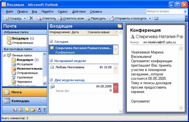 Присланные вам сообщения появляются в папке Входящие (см. рис.8.5). Непрочитанные письма выделяются жирным шрифтом, прочесть их можно, либо выделив строку-заголовок нужного письма (в этом случае его текст будет выведен в этом же окне), либо дважды щелкнув по строке-заголовку (в этом случае текст появится в отдельном окне).