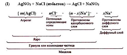 Таким образом, формулы мицелл гидрозоля хлорида серебра в избытке хлорида натрия (I) и хлорида серебра в избытке нитрата серебра (II) можно записать так: