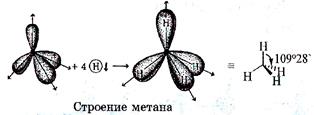 В молекуле метана атом углерода связан с четырьмя атомами водорода (СН4). Электронная формула углерода в основном состоянии 1s22s22р2, а в возбужденном состоянии 1s,22s12рз. Атом углерода в возбужденном состоянии имеет четыре неспаренных электрона и может связаться с четырьмя атомами водорода. Все четыре связи С–Н в метане одинаковы по длине и прочности, что можно объяснить с привлечением гипотезы о гибридизации атомных орбиталей, имеющие форму неправильной восьмерки – sр3-гибридизация.