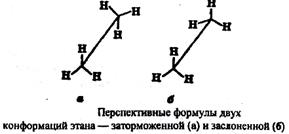 Данные положения углеродной цепи называются конформациями. При обычных температурах разные конформации алканов свободно переходят друг в друга путем вращения С–С связей, поэтому очень часто конформации называют поворотными изомерами. Так, в молекуле этана С2Н6 возможны два основных положения групп CH3 друг относительно друга – «заторможенное» и «заслоненное».
