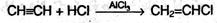 2. Гидрогалогенирование. Галогеноводороды присоединяются к тройной связи труднее, чем к двойной. Для активации галогеноводорода используют АlСl3 – сильную кислоту Льюиса. Из ацетилена при этом можно получить винилхлорид (хлорэтен), который используют для получения важного полимера – поливинилхлорида.