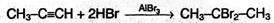 В случае избытка галогеноводорода происходит полное гидрогалогенирование, причем для несимметричных алкинов на каждой стадии присоединение идет по правилу Марковникова, например: