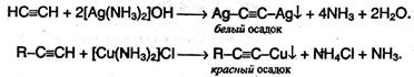 Ацетилениды серебра и меди (I) легко образуются и выпадают в осадок при пропускании ацетилена через аммиачный раствор оксида серебра или хлорида меди (I). Эти реакции служат для обнаружения алкинов с тройной связью на конце цепи.