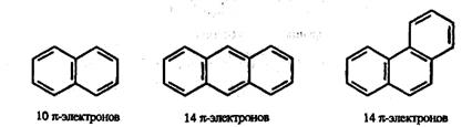 Согласно этому правилу, ароматические молекулы должны иметь плоский циклический σ-скелет и число обобщенных π-электронов, равное 4n + 2, где n= 1, 2, 3 и т.д. Только в этом случае молекула будет обладать ароматическим характером. Число обобщенных π-электронов может быть 6, 10, 14 и т.д. Примерами служат выделяемые из каменноугольной смолы полиядерные конденсированные ароматические углеводороды – нафталин, антрацен, фенантрен. В них бензольные кольца соединены друг с другом линейно (как в антрацене) или нелинейно (как в фенантрене):