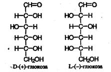 Все эти вещества содержат три или четыре асимметрических атома углерода, поэтому они проявляют оптическую активность и могут существовать в виде оптических изомеров. Знак в скобках в названии углевода обозначает направление вращения плоскости поляризации света: (–) обозначает левое вращение, (+) – правое вращение. Буква D перед знаком вращения означает, что во всех этих веществах асимметрический атом углерода, наиболее удаленный от карбонильной группы, имеет такую же конфигурацию (т.е. направление связей с заместителями), что и глицериновый альдегид, структура которого приведена выше. Углеводы с противоположной конфигурацией относятся к L-ряду: