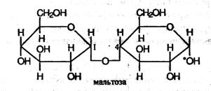 Молекула мальтозы состоит из двух остатков глюкозы (левый – α-глюкоза) в пиранозной форме, соединенных через 1-й и 4-й атомы углерода: