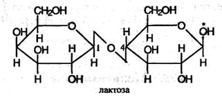 Лактоза состоит из остатков β-галактозы и глюкозы в пиранозной форме, соединенных через 1-й и 4-й атомы углерода: