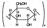 Целлюлоза – природный полимер. В отличие от крахмала, ее молекулы состоят только из линейных цепей, содержащих остатки β-глюкозы, которые связаны через первый и четвертый атомы углерода. Фрагмент линейной структуры целлюлозы выглядит следующим образом: