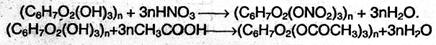 Для целлюлозы характерны реакции образования сложных эфиров. Каждое структурное звено молекулы целлюлозы содержит по три группы ОН, которые могут реагировать с азотной и уксусной кислотой: