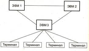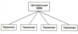 Принцип централизованной обработки данных (рис. 1) не отвечал высоким требованиям к надежности процесса обработки, затруднял развитие систем и не мог обеспечить необходимые временные параметры при диалоговой обработке данных в многопользовательском режиме. Кратковременный выход из строя центральной ЭВМ приводил к роковым последствиям для системы в целом, так как приходилось дублировать функции центральной ЭВМ, значительно увеличивая затраты на создание и эксплуатацию систем обработки данных.