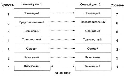 Взаимодействие двух узлов из различных сетей схематически показано на рис. 11. Обмен информацией между одноименными уровнями определяется протоколами, речь о которых шла выше.