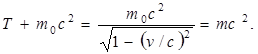 При v= 0, m= m0 и Т= 0. Отсюда для константы получается значение, равное – m0c2. Следовательно, релятивистское выражение для кинетической энергии частицы имеет вид