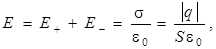 Формула (7.5) позволяет провести расчет поля плоского конденсатора как поля двух параллельных плоскостей с равными по модулю и противоположными по знаку поверхностными зарядами (рис. 7.4а).