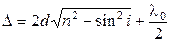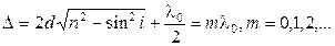 напряженности луча 1 при отражении от оптически более плотной среды изменяет свою фазу на π или луч 1 теряет полволны. λ0 – длина волны в вакууме. Подставляя параметры пленки и угол падения в формулу (4.3), для оптической разности хода можно окончательно записать: