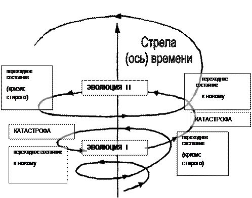 Таким образом, развитие живой и неживой материи содержит несколько последовательных этапов. Этих этапов четыре: эволюция, кризис, катастрофа, переходное состояние к новому этапу эволюции. Кризис сопровождается ослаблением внутренних связей системы, приводящим к возникновению неустойчивости системы. Кризис разрешается катастрофой. На осколках системы зарождается новое поколение объектов и состояний живой и неживой природы - возникает переходное состояние к очередному этапу эволюции. Такая последовательность фаз составляет характерный цикл развития. Длительность этого цикла определяется видом природных систем. Эту длительность можно считать внутренним временем системы.