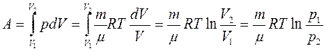 Так как при постоянной температуре внутренняя энергия идеального газа не изменяется, то первое начало термодинамики для изотермического процесса: