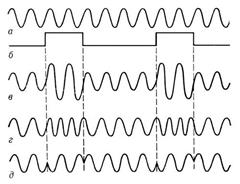 Модуляция колебаний – это изменение амплитуды, частоты или фазы колебаний по определённому закону. Различают амплитудную модуляцию (в), частотную модуляцию (г) и фазовую модуляцию (д).