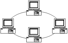 Топология кольцо предусматривает соединение узлов сети замкнутым контуром и используется для построения сетей, занимающих сравнительно небольшое пространство. Выход одного узла сети соединяется с входом другого. Информация по кольцу передаются от узла к узлу в одном направлении. Каждый промежуточный узел ретранслирует посланное сообщение. Принимающий узел распознает и получает только адресованное ему послание.