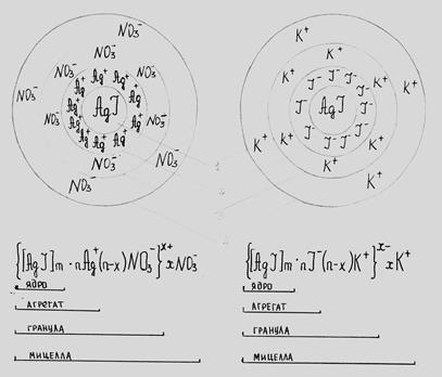 Рассмотрим, без учета влияния интермицеллярной жидкости, упрощенные схемы мицеллы иодида серебра, полученные по реакции: