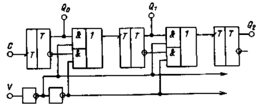 Рис. 2. Схема трехразрядного суммирующего счетчика с последовательным переносом