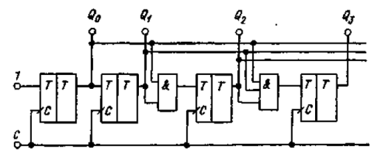 В данной структуре триггер, формирующий сигнал Q0, по-прежнему остался асинхронным, поэтому его входной сигнал T≡1. Счетчики, реализующие этот алгоритм работы, называются счетчиками с параллельным переносом.