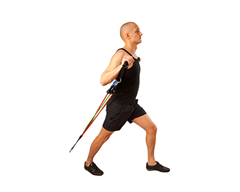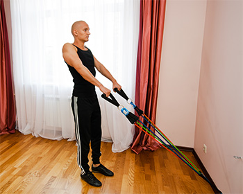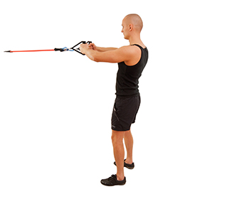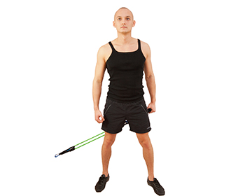 Исходное положение:Пристегните концы эластичной трубки или нескольких трубок к двум ручкам. Встаньте обеми ногами на эластичной трубки. Руки опущены перед собой. Мышцы поясницы напряжены и прочно держат естественный, S-образный изгиб позвоночника, грудь и плечи расправлены.
