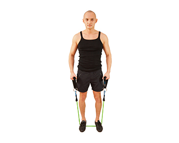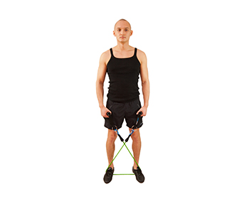 Исходное положение:Пристегните концы эластичной трубки к двум ручкам и обхватите их руками верхним хватом. Встаньте обеми ногами на эластичные трубки. Руки опущены вдоль тела, ладони повернуты к бедрам.