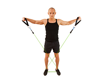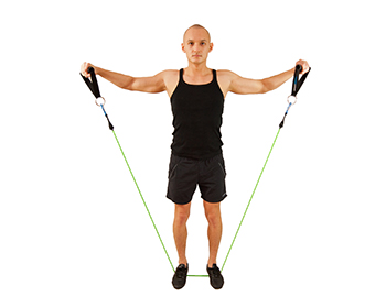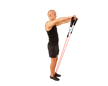 Исходное положение:Пристегните концы эластичной трубки к двум ручкам и обхватите их руками верхним хватом. Встаньте обеми ногами на эластичные трубки. Руки опущены перед собой.
