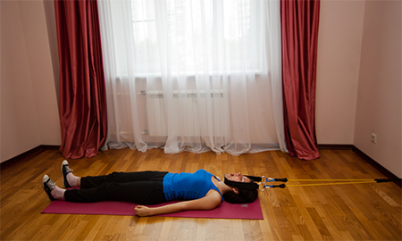 Советы по упражнению: Если лямка соскакивает с подбородка, положите под голову руки.
