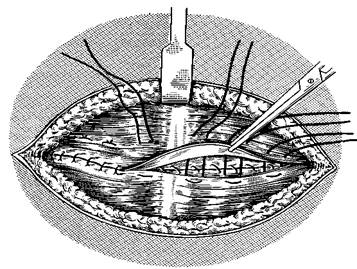 The fascial defect is then bridged with prosthesis without fear of contact with the intra-abdominal viscera. The prosthesis is sutured circumferentially to the defect; alternatively, it can be sutured to the undersurface of the posterior rectus sheath and the linea alba above the peritoneal closure. If the peritoneum cannot be kept intact beneath the defect, omentum should be tacked to the peritoneum circumferentially to isolate the abdominal viscera from the prosthesis at least to some degree.