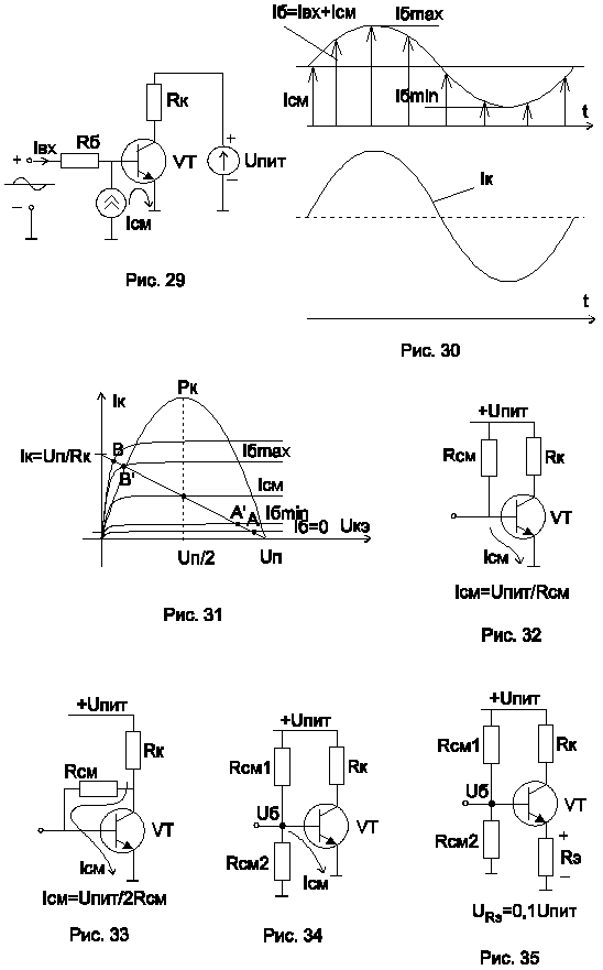 В усилительном режиме в общем случае входной сигнал может быть знакопеременным, например, синусоидальным. Переход база-эмиттер является диодным p-n переходом. Чтобы входная цепь транзистора могла работать с сигналом переменного тока, необходимо переход база-эмиттер сместить в прямом направлении, т.е. задать в базовой цепи рабочую точку по постоянному току. Относительно этого постоянного тока можно подавать в базовую цепь сигнал переменного тока, который будет усиливаться. Схема включения транзистора с общим эмиттером и диаграммы его работы в режиме усиления гармонического сигнала представлены соответственно на рис. 29 и 30, где Iсм - постоянный ток смещения базы. Постоянный ток смещения базы будет определять постоянную составляющую тока коллектора в соответствии с соотношением Iк=Iб×h21Э. В усилительном режиме возможные рабочие точки находятся на нагрузочной прямой между точками А¢ и В¢ на рис. 31. Ток смещения должен выводить рабочую точку коллектора транзистора по постоянному току на середину отрезка А¢ В¢, чтобы напряжение на коллекторе могло изменяться от этой середины как в сторону источника питания, так и в сторону общей точки.