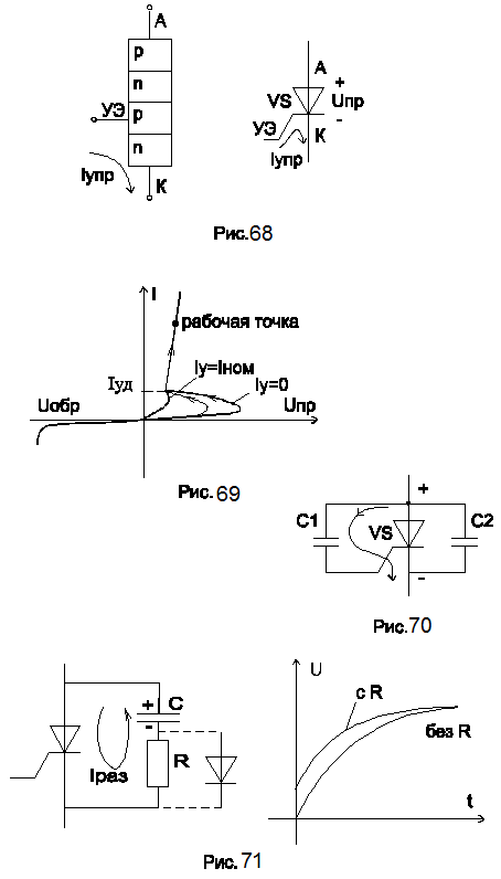 Тиристор является четырехслойным прибором. Создается исключительно на основе кремния. Его структура показана на рис. 68. Вольт-амперные характеристики тиристоров представлены на рис. 69.